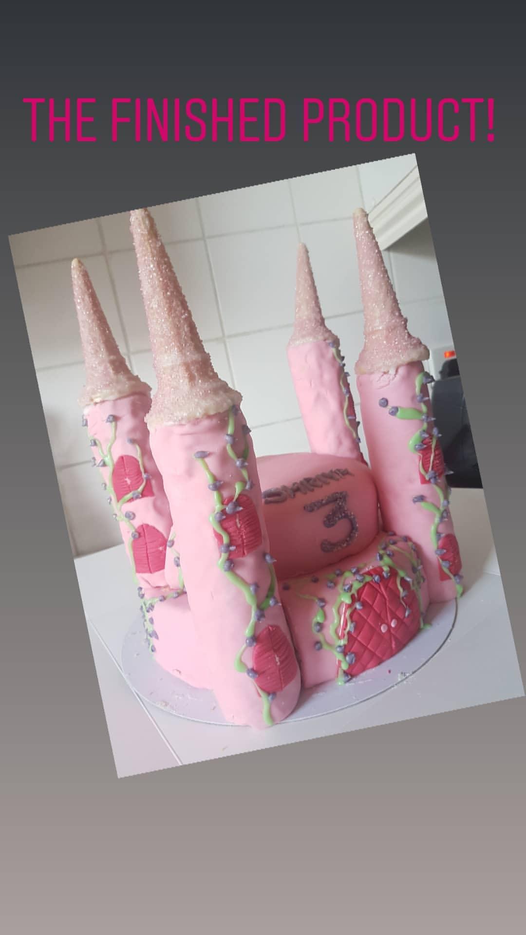 - Cover four Ice Cream cones in simple icing (icing sugar & water) and then dip the ice cream cones in pink glitter. Leave to dry before adding these to the top of the Rice Crispy towers to create the turrets.